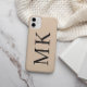 Na moda capa de telefone em bege com suas iniciais em letras grandes. Capa de telefone gráfica com um monograma limpo em letras pretas contra um fundo bege de amêndoa. Capa de telefone monograma em bege e preto