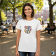 A design de camiseta ocular apresenta a frase "Grins for Dourado" em um gradiente multicolorido vibrante. Cada letra transita perfeitamente para o próximo, criando uma aparência dinâmica e alegre.