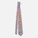 A colorful necktie with a vibrant geometric pattern featuring diamonds and circles in orange, blue, pink, and white on a plain white background.