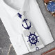 Este design decorativo apresenta uma âncora azul marinho escura e uma roda de barco com cinzas e listras brancas. A ilustração náutica cria uma gravata moderna e única com cor de fundo personalizada.
