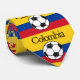 A bandeira da Colômbia, 3 bandas, amarela, azul e vermelha. Por cima, está um desenho de uma bola de futebol preto e branco.