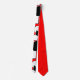 Esta gravata tem um design Bauhaus de triângulos, círculos, retângulos e pentágonos em preto e branco num campo de vermelho.