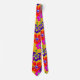 Gravatas com um impressão floral grande e ousado de flores de hibisco coloridas. As flores ilustradas são vermelhas, cor-de-rosa e roxas, sobre uma cor de fundo dourada.