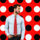 Esta gravata marcante apresenta um padrão alternado de bolinhas pretas e brancas sobre um fundo vermelho.