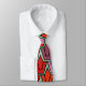 Esta gravata tem um design de tulipas de deco de arte de pentágonos e trapezoides em laranja, vermelho, roxo, ouro e verde.