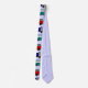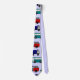 Esta gravata tem um design de caminhões e ônibus novidade em vermelho, azul, verde e marrom em um campo de azul claro.
