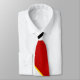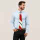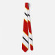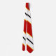 Você vai ficar excelente nesta gravata vermelha e branca com listras finas, pretas e laranja.