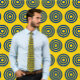 Legal gravata com padrão repetitivo de círculos concêntricos pretos sobre fundo dourado. Um elogio de escolha de excelente a uma roupa de punk ou rock n'roll.