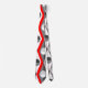Esta gravata tem um design de deco de dois círculos de dois tons dentro de diamantes em duas cinzas e branco em um campo de vermelho.