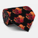 Um dramático padrão repetitivo de dálias nas cores do outono de vermelho, laranja e ouro sobre fundo negro enfeita esta gravata impressionante, criando um design geométrico, abstrato.