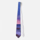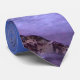 Uma gravata com uma fotografia adorável que apresenta cores marcantes de roxo, azul e rosa no pôr do sol. Uma bonito linha costeira espalhada por rochas.