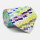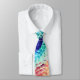 A pena geométrica de pavão detalha desenho colorido em uma gravata.