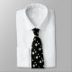 Gravata linda com pontos elegantes de bolinhas em azul claro e cores douradas em fundo preto.