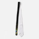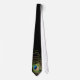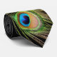 Bela gravata preta com close-up de pena de pavão colorida.