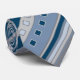 Esta gravata apresenta um padrão stripado geométrico com quadrados em azul-marinho, azul-claro e cinza para um aspecto moderno.