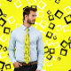 Um legal gravata retrô com um padrão de quadrados colocados aleatoriamente em preto e branco sobre amarelo neon.