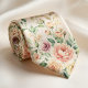 Linda gravata com rosas suaves de pêssego e creme misturadas com folhas verdes delicadas em um fundo claro. O padrão tem um charme gentil e romântico vintage que parece fresco e elegante. É uma escolha adorável para casamentos, festas no jardim ou qualquer ocasião em que você queira uma gravata floral sutil que pareça refinada e de bom gosto.