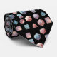Um colar preto na moda com um padrão lúdico de dados RPG, incluindo d4, d6, d8, d10, d12 e d20 em matizes cor-de-rosa e azuis pastel. Perfeito para entusiastas de jogos de mesa, fãs de Dungeons & Dragon, ou qualquer pessoa que queira adicionar um talento exclusivo e geek à sua roupa formal ou casual.
