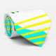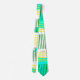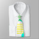 Esta gravata tem uma design moderna do século médio que se parece com uma tecelagem com linhas amarelas e verdes num campo de azul claro com nuvens.
