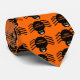 Esta bela gravata de Halloween apresenta uma gravata assustadora com muitas aranhas pretas com oito pernas peludas, olhos amarelos com grandes pupilas pretas e suas bocas abertas mostrando suas presas. A gravata é laranja e há um texto laranja na parte de trás de todas as aranhas que diz "feliz Dia das Bruxas".