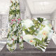 Uma orquídea branca cintilante e verdes tropicais aquinheira pintada de gravata floral do pescoço, apresentando orquídeas pintadas de cor aquosa em floração com folhas de palmeiras e verde tropical.