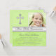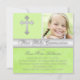 Convide todos os seus amigos e família para a primeira Comunhão Santa da sua filha com este bonito convite da Primeira Comunhão de prata e verde com uma Cruz de prata e uma área de modelo para que você carregue a foto da sua filha. A escolha do papel e a maioria do texto é personalizável. Se você precisar de qualquer outro item nesse estilo de design, como cartões de agradecimento, cartões de agradecimentos de fotos ou qualquer outro item para fazer com que este dia especial seja especial, envie um e-mail com sua solicitação para niteowlstudio@gmail.com.