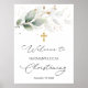 Este design apresenta uma ilustração da folhagem verde e dourada no estilo de aquarela. Acima das folhas - o confetti enfeita o topo do poster (suas imagens podem ser removidas). Abaixo da folhagem verde há uma imagem de uma Cruz.