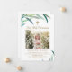 A aquarela botânica do eucalipto sai com a foto da criança, o convite religioso do primeiro anúncio da Comunhão.