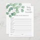 Celebre a futura mãe em estilo com a nossa festa de chá de fraldas de eucalipto. Esta bela design apresenta elegantes aquarelas folhas de eucalipto. Peça o seu hoje! Itens correspondentes disponíveis! Respostas: CRAVINGS, CRYING, PACIFIER, FRASCO, LUZ NOTURNA, LULLABY, STROLLER, EPIDURAL, BURP, ALTA CADEIRA, SACO DE FRALDA, SWADDLE