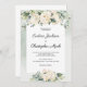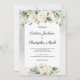 Este é o convite de casamento boêmico no estilo boho mostra folhagem verde e eucalipto com rosas brancas e faíscas douradas