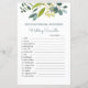 Este design apresenta uma ilustração aquosa da folhagem verde com folhas de eucalipto. Jogos de Chá de panela verde - Cartão duplo - Dois jogos em um! Bridal What's in your Purse Game na frente da carta e do jogo Wedding Scramble no sentido inverso. A chave da resposta: noiva, noiva, bolo de casamento, lua de mel, amor verdadeiro, vestido branco, rendas, felicidade, união de velas, dama de honra, padrinhos de casamento, oficial, capela, votos casamentos, portador de anéis