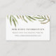 Estas cartas correspondem à nossa coleção de casamentos botânicos de cor aquática Greenery e são uma forma elegante e discreta de direcionar convidados para o seu site de casamento para mais informações. O design apresenta um spray de folhas verdes de aquarelas no topo, com três linhas de texto personalizado em caracteres simples de bloco verde-oliva.