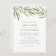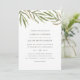 Os convites de casamento botânico a cores aquáticas elegantes apresentam um trio de galhos verdes e folhas no topo para um olhar inspirado na natureza cômica nas cores da tendência de casamento de 2017. Personalize com seus detalhes de casamento em verde-oliva escuro subestimado. Cartões que se revertem a um sutil padrão de latência de diamante em azeitona e branco.