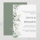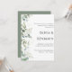 Convite de casamento personalizável. Possui uma borda verde de folhagem de eucalipto em um fundo branco limpo.