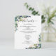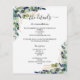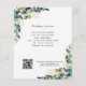 Um moderno e elegante programa/programa/cronograma de casamento. Um fundo branco decorado com verde de eucalipto e folhagem de ouro. Personalize e adicione seus nomes e detalhes do casamento. Letras pretas coloridas. Texto de ambos os lados. Adicione o URL do seu site de casamento ao código QR no verso. 1 folha = 1 programa impresso borda a borda.