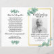[Todo o texto é EDITÁVEL] Programa Funeral dobrável e econômico com uma foto na frente e duas fotos na página dentro. Tema: Greenery Eucalyptus Sai. Estilo: Elegante e Calmo. Sexo: Unisex. Cores: Verde, Branco, Faux Dourado. Gráficos: folhas de eucalipto desenhadas à mão por aquarelas, quadros de ouro falsos.