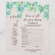 Este jogo verde "como você conhece a noiva" é perfeito para um chá de panela temático de folha rústica ou floresta. A frente do cartão de jogo apresenta "como você conhece bem a noiva", e a parte de trás do cartão contém "o que há na bolsa". A design apresenta um belo buquê verde de folhas e galhos com flores brancas de anêmona e uma letra elegante de escrita caligráfica sobre um fundo bege creme. Personalize a parte frontal da placa com o nome da noiva e a data do chá de casamento. Desenhado com o Care por Miriam na Fresca e Iummy Paperie. Para coordenar itens, visite minha loja Zazzle: