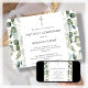 Celebre a Primeira Comunhão do seu filho em estilo com nossos convites personalizáveis com um belo crucifixo de ouro e uma folhagem elegante de eucalipto em um fundo branco nítido. Estes convites são perfeitos para convidar seus entes queridos para este evento especial de marco. Nossos convites têm opções fáceis de personalização, você pode adicionar o nome do seu filho e a data, hora e local do evento. E mais, com a opção de descarregá-los instantaneamente, você pode mandá-los para fora em breve!