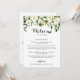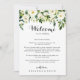 Esta carta de boas-vindas florais verde branca é perfeita para um casamento rústico. O design apresenta elegantes pedras brancas de aquarela com folhagem verde. Personalize a frente com uma mensagem de boas-vindas para seus convidados e seus nomes. Personalize as costas com a programação de eventos e outras informações úteis.