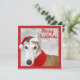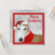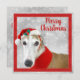 Natal de Greyhound - Um galo vermelho e branco vestido com um chapéu vermelho de Papai Noel e colarinho vermelho em um fundo de neve de cinza prateada. Enquadrado com um quadro quadrado vermelho. Feliz Natal em letra vermelha pode ser personalizado com sua mensagem.