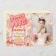 Groovy One First Photo Birthday Invitation faz parte da coleção Groovy Birthday. Este produto apresenta arco-íris, estilo retrô, flores, planetas e cogumelos. Feito principalmente em cores amarelas e vermelhas com fontes decorativas. Explore mais produtos correspondentes em nossa loja.