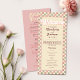 Este ousado programa de casamento cor-de-rosa abraça um tema dos anos 70, com florais vibrantes e uma borda retrorada, e espaço para você adicionar seus próprios detalhes da cerimônia de casamento e festa de noiva. Este design é perfeito para casais que amam o encanto da vintagem com uma reviravolta moderna. Ideal para casamentos de verão, inspirados no retrô, ou boho, este menu captura uma estética divertida e livre. Explore itens correspondentes na nossa suíte de casamento para completar a aparência!