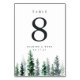 Cartões de números de tabela em madeira para vitrines apresentam um conjunto de pinheiros com aquarelas em verde-caçador e verde-sábio. Personalize com cada número da tabela, com seus nomes e data de casamento embaixo. Design repete-se no lado oposto. Coordena-se com a nossa suíte de convite para casamento em Timber Grove.