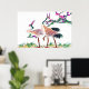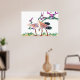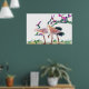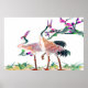 Esta grua vermelha cortada tem dois guindastes debaixo de uma árvore com um fundo branco cada guindaste tem um bico rosa e penas cor-de-rosa sob o galho da árvore com a flor rosa e um fundo branco. Esta é uma bela foto. nesta poster