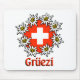 Os edelweiss estilizados cercam uma bandeira suíça com o cumprimento suíço amigável abaixo.