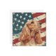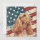 A watercolor portrait of a beautiful buff colored Cocker Spaniel Dog is placed against a grunge background of the USA flag. The back of this all occasion flat card has a text field for you to customize.
