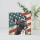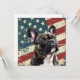A watercolor portrait of a beautiful French Bulldog is placed against a grunge background of the USA flag. The back of this all occasion flat card has a text field for you to customize.