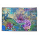 Design de Pavão Ilustrado e Flores Azuis e Púrpuras com fundo azul e amarelo verde e cobertura de escrita manual