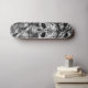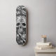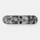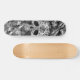 Este baralho de skate assustador apresenta um design de crânio preto e branco. Um skate que certamente vira cabeças e impressiona companheiros de bordo no skate Park.