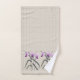 As gravuras botânicas roxas da orquídea de Arundina emparelhadas com uma borboleta antiga da aguarela em um grupo tan cremoso de toalha de banho do fundo da listra têm uma cortina de chá, um tapete de banho, e um suporte da escova de dentes/distribuidor de coordenação do sabão ajustado.